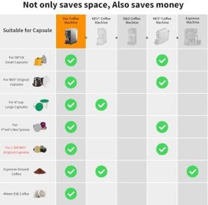 Versatility at Its Best This machine is a true 4-in-1, compatible with K-Cups, Nespresso Original Capsules, ground coffee, and 44mm ESE pods. It even works with Dolce Gusto,Lavazza Blue,and more (though you’ll need to buy specific pods from KOTLIE). |