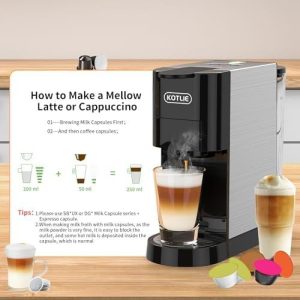 The KOTLIE 5in1 Espresso Machine is a versatile coffee maker designed to cater to a wide range of brewing preferences. Whether you’re a fan of K-Cup capsules, Nespresso Original, Dolce Gusto, ground coffee, or 44mm ESE pods, this machine has you covered.